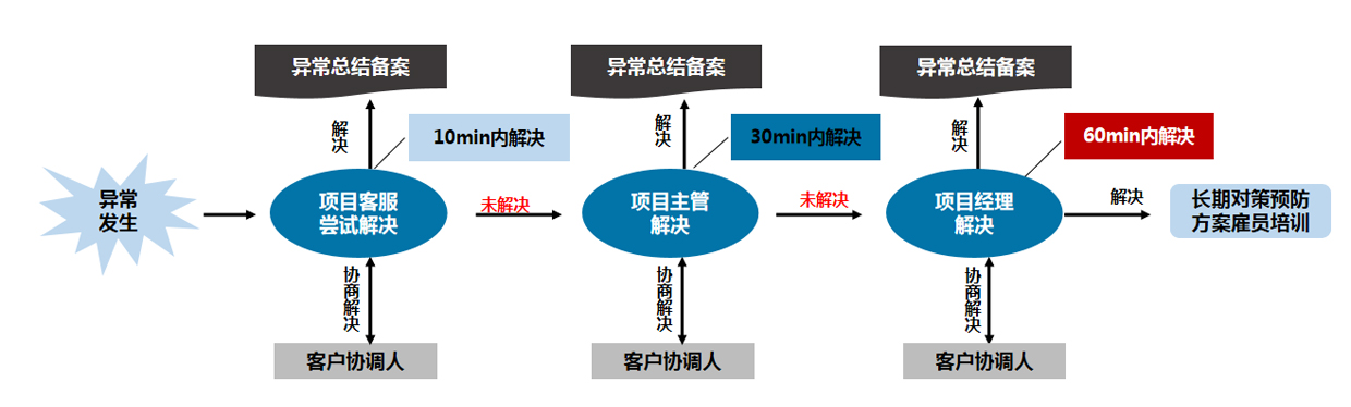 緊急通(tōng)道(dào):項目客服/項目主管根據預案及經驗判斷異常的(de)緊急度,緊急事(shì)件(jiàn)需要(yào)立即通(tōng)知(zhī)到(dào)客戶現(xiàn)場(chǎng)♦最高(gāo)主管和(hé)明(míng)企負責人(rén)及所有(yǒu)相(xiàng)關方